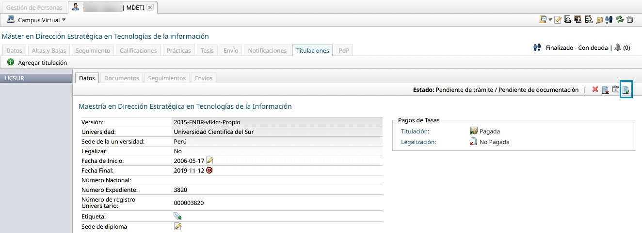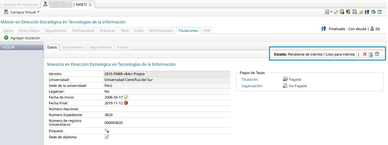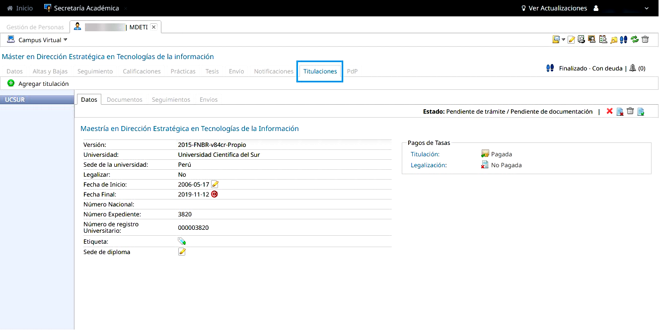 Tab Titulaciones de la ficha académica.