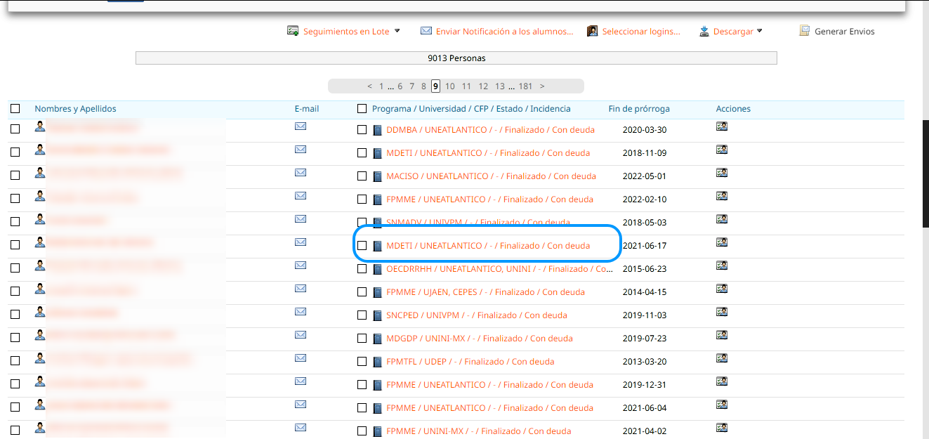 Búsqueda de la inscripción a cambiar el estado de la titulación, recordar que las inscripciones deben estar en estado Finalizado/Con deuda.