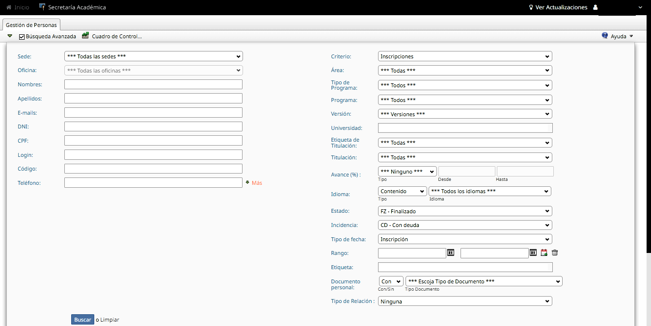 Búsqueda de fichas académicas (Inscripciones).