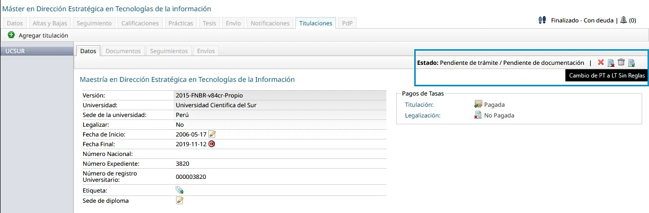 Se realiza el cambio de estado de la titulación, de Pendiente de trámite / Pendiente de documentación pasa a Pendiente de trámite / Listo para trámite.