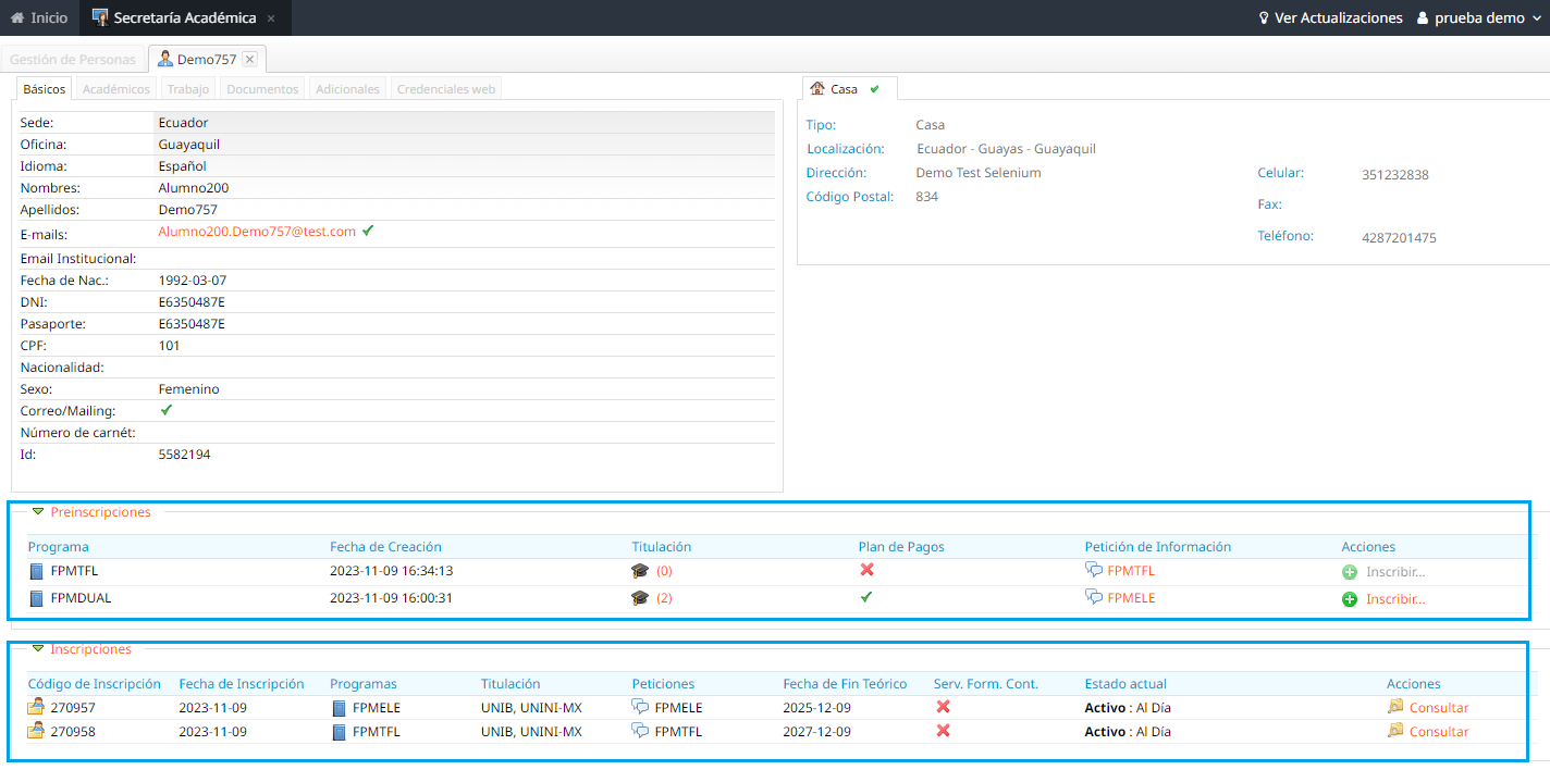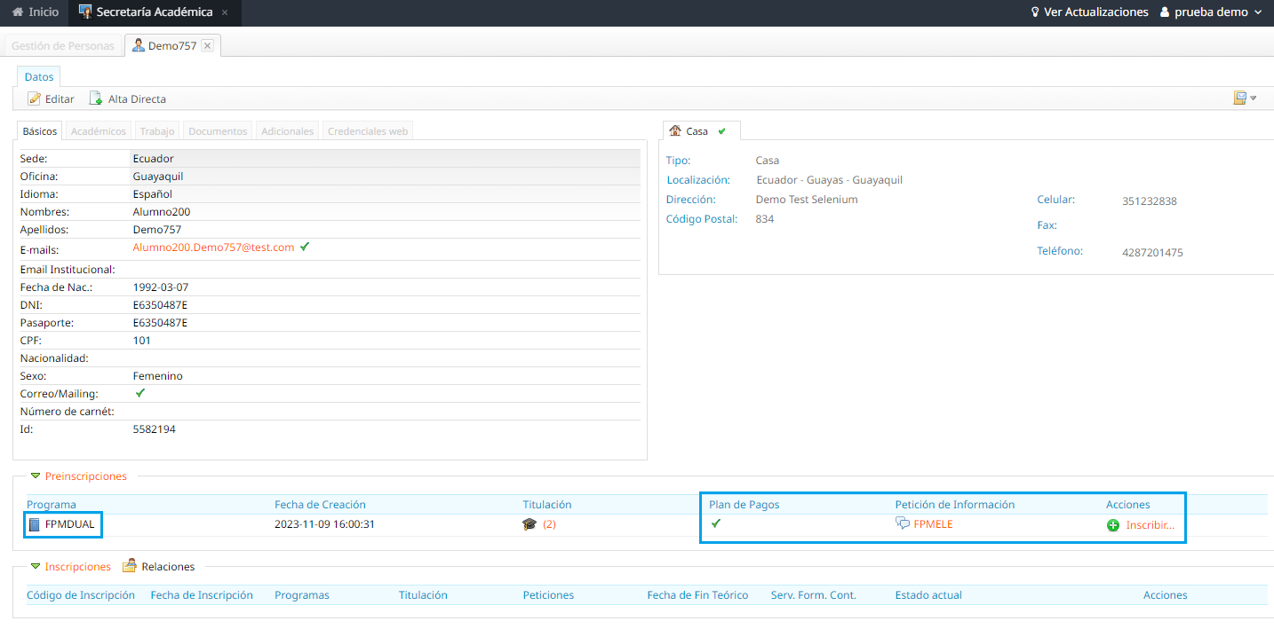 Se crea de forma automática la petición de información, preinscripción del programa relacionado y la inscripción en los dos programas.