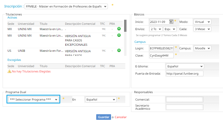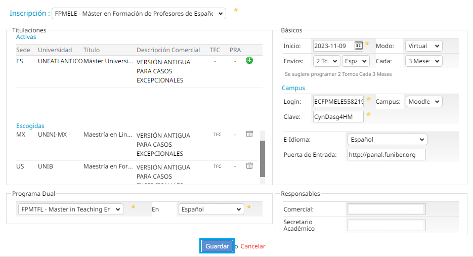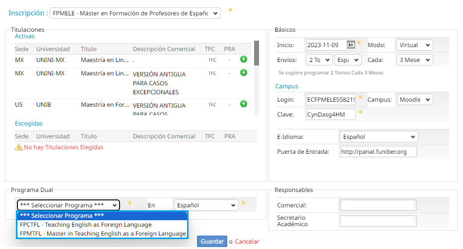 Seleccionar las titulaciones, el Responsable Comercial y el Secretario Académico correspondiente. Dar clic en el botón Guardar.