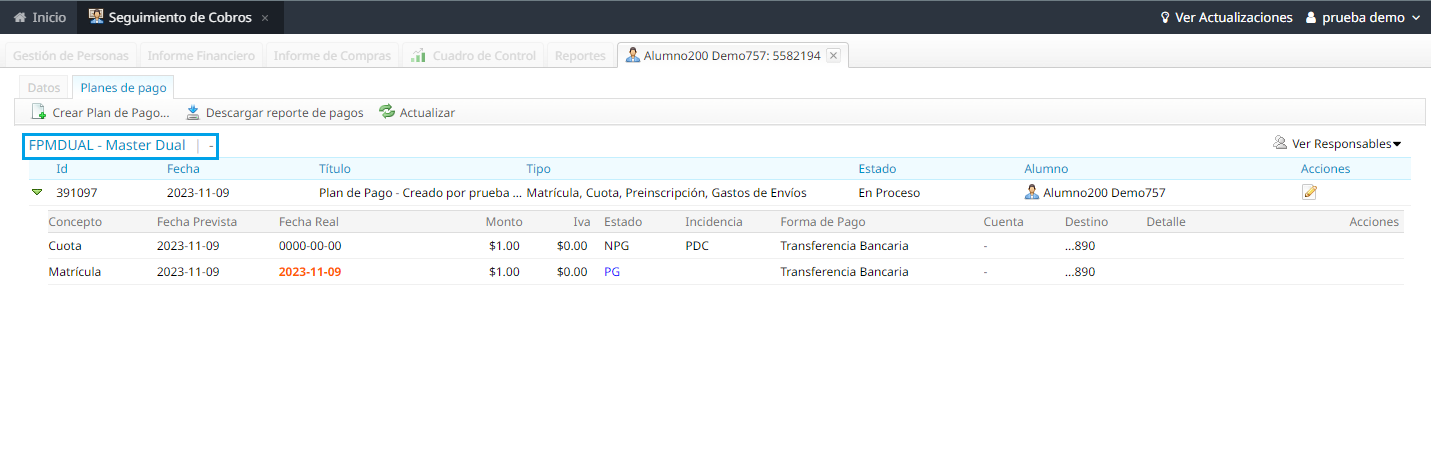 Se procede a la creación del pdp por parte del área financiera, estará asociado al programa: FP - FPMDUAL - Master Dual.