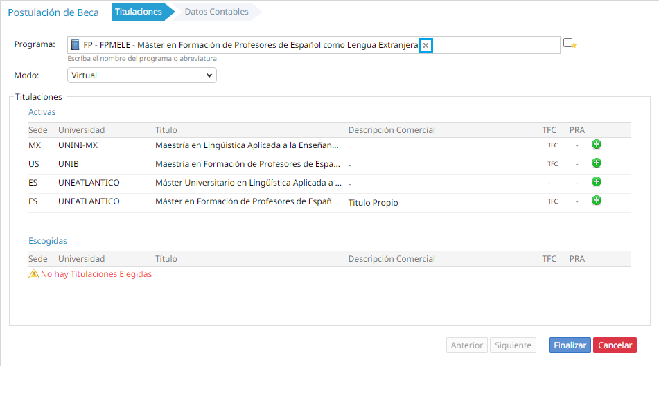Seleccionar el programa FPMELE o FPMTFL según sea el caso. Aquí también da la opción de relacionar el programa FPCTFL - Teaching English as Foreign Language.