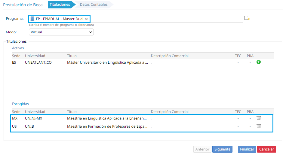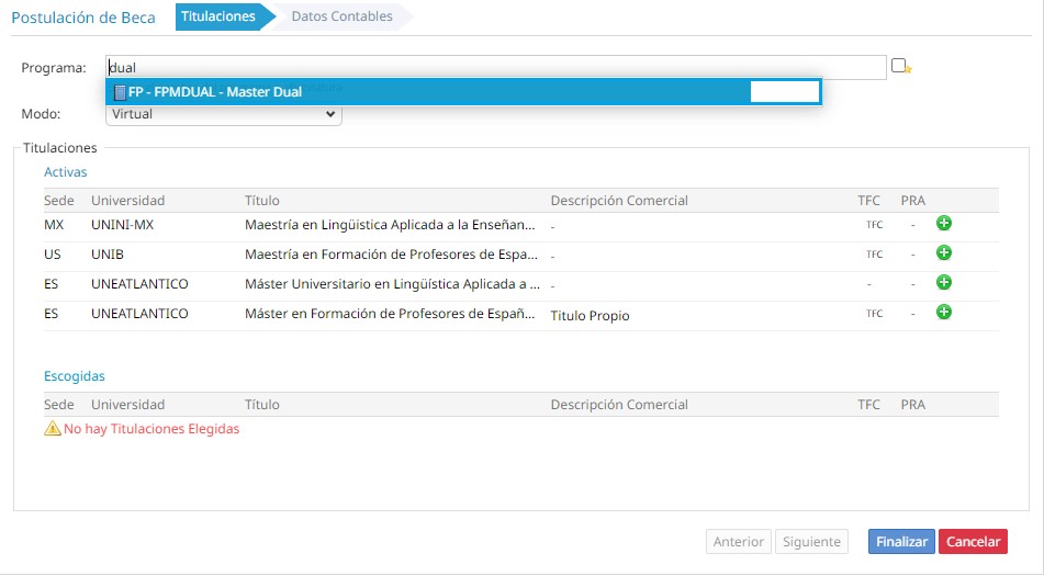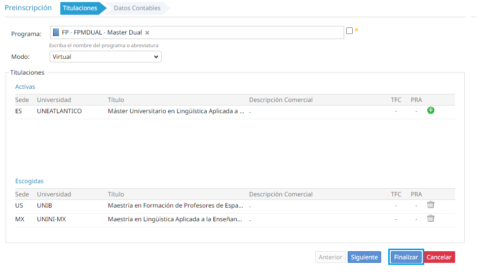 Preinscripción. Traer por defecto en el campo programa: FP - FPMDUAL - Master Dual, se confirma la información de titulaciones y datos contables. Clic en el botón Finalizar.