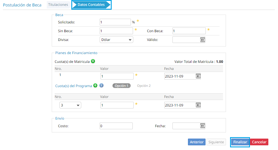 Adicionar la información financiera correspondiente. Dar clic en el botón Finalizar.