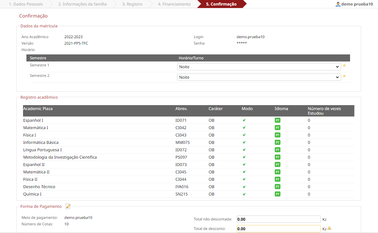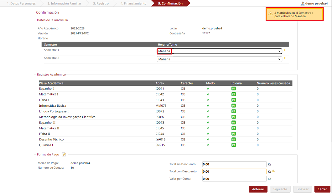 Matriculación – Tab [Confirmación]