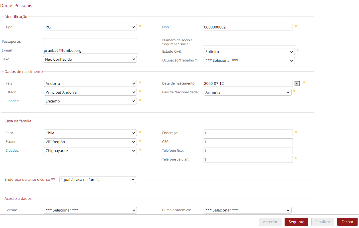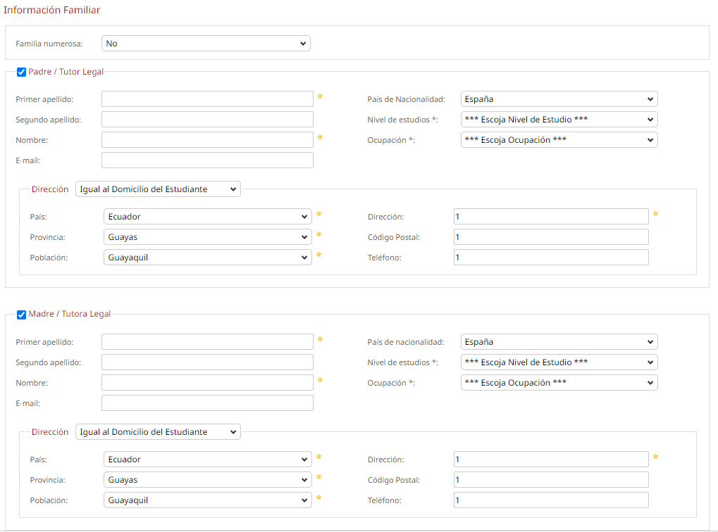 - Domicilio Familiar: País, provincia, población, dirección, código postal, teléfono móvil.