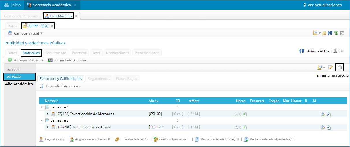 - El estado de la inscripción asociada a la matrícula debe ser distinta a “Baja”.