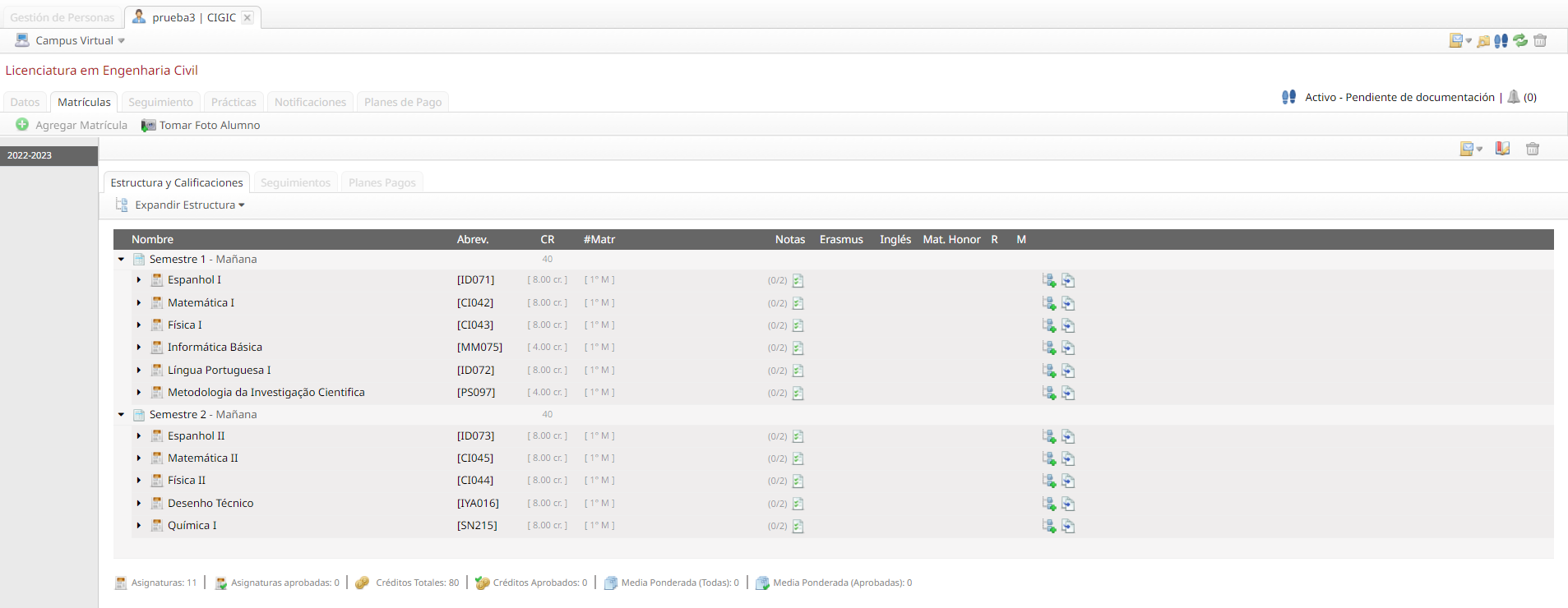 - Registro Académico: Se visualiza las asignaturas seleccionadas con su idioma de impartición, abreviatura, carácter y número de veces que fue cursada.