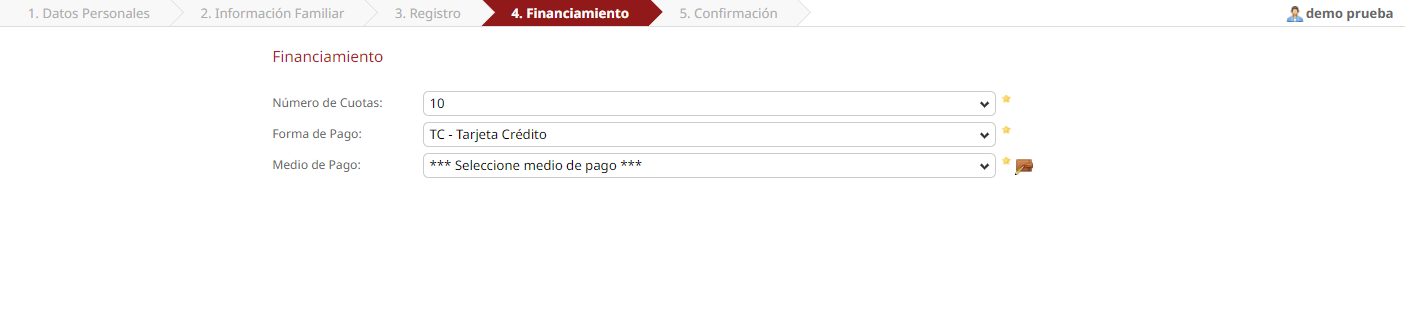 Medio de pago: El medio de pago permite el registro de datos contables del estudiante o persona que realizará el pago, este dependerá de la forma de pago seleccionada; se podrá registrar datos de: