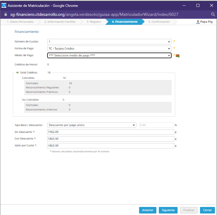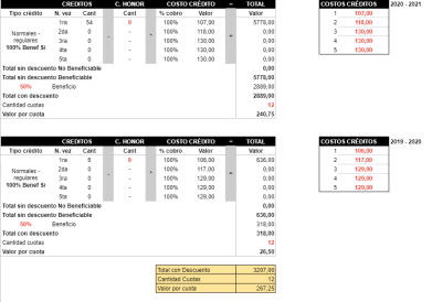 En los primeros dos escenarios, el valor es calculado automáticamente por el sistema en base a las asignaturas seleccionadas y/o descuento/beca seleccionada. El valor que se presenta es con el descuento/beca aplicada.
