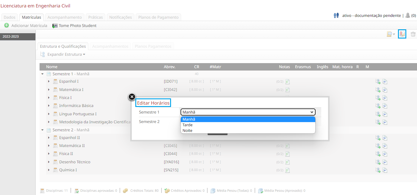 - Horario/Turno: Se elige un Turno/horario para cada semestre durante el período lectivo actual, ya sea en la mañana, tarde o noche.