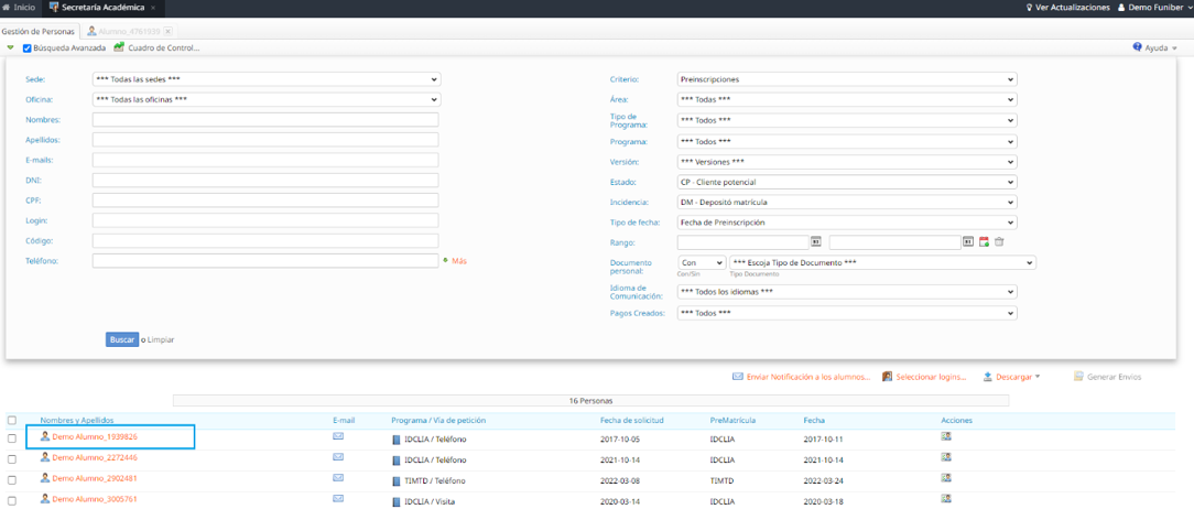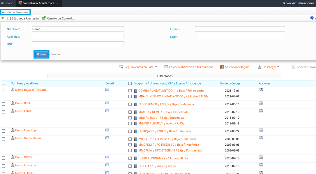 Al realizar una búsqueda en la aplicación Secretaría Académica, se mostrará un listado de personas registradas en el sistema de gestión. Este listado nos permitirá acceder a las fichas personales de cada usuario registrado.
