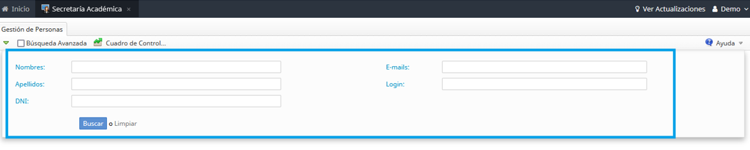 En esta sección el usuario podrá realizar una búsqueda simple o una búsqueda avanzada de las personas que están registradas en el sistema de gestión.