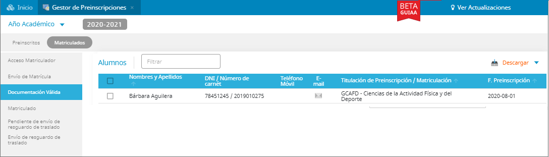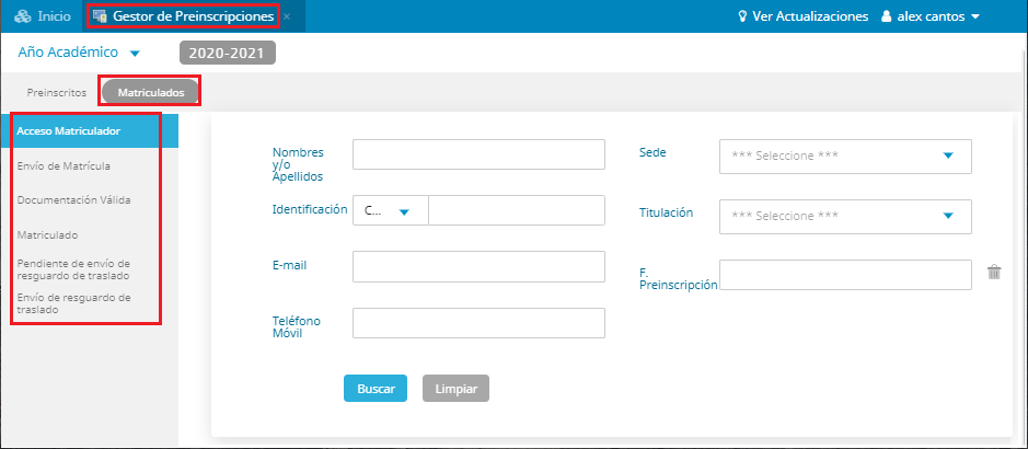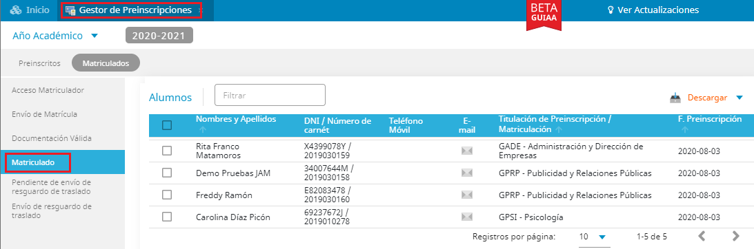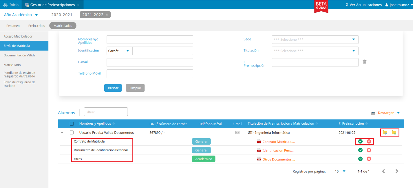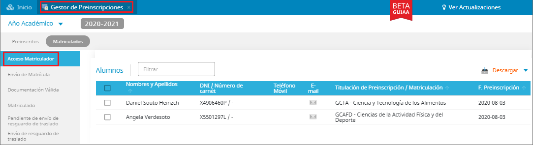 - Envía matrícula y el apartado Matriculado, que corresponde a todos las preinscripciones que tienen asociada una inscripción y matricula activa en el periodo actual.