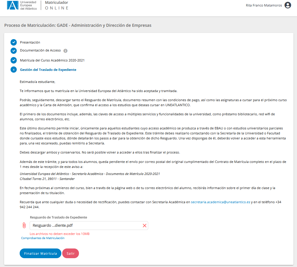 - En la app. Matriculador Online se habilita al alumno el [Paso 4]. En este paso el alumno debe adjuntar el documento [Resguardo de Traslado de Expediente] y seleccionar la opción [Finalizar Matrícula].