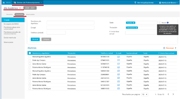 Puede consultar todas las preinscripciones existentes en el año académico seleccionado y con los siguientes criterios de búsqueda:
