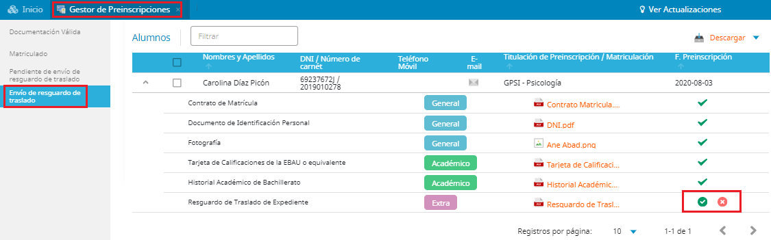 - Aprobar documento✅: Si los documentos enviados por el alumno cumplen con lo requerido por la universidad: