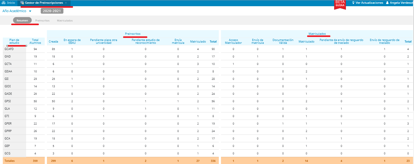 Por cada plan de estudio se presenta un total general y un total de alumnos preinscritos y un total de matriculados.