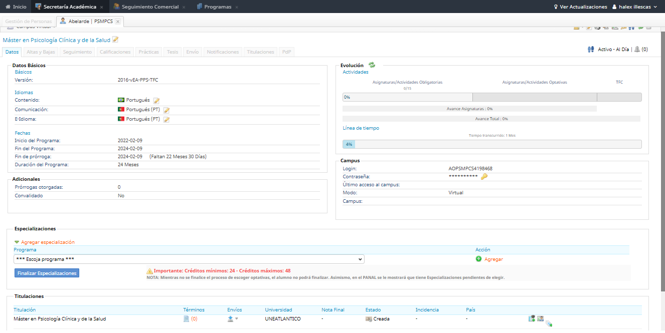 - Titulaciones disponibles: Campo que muestra las titulaciones disponibles para la versión del programa seleccionado.