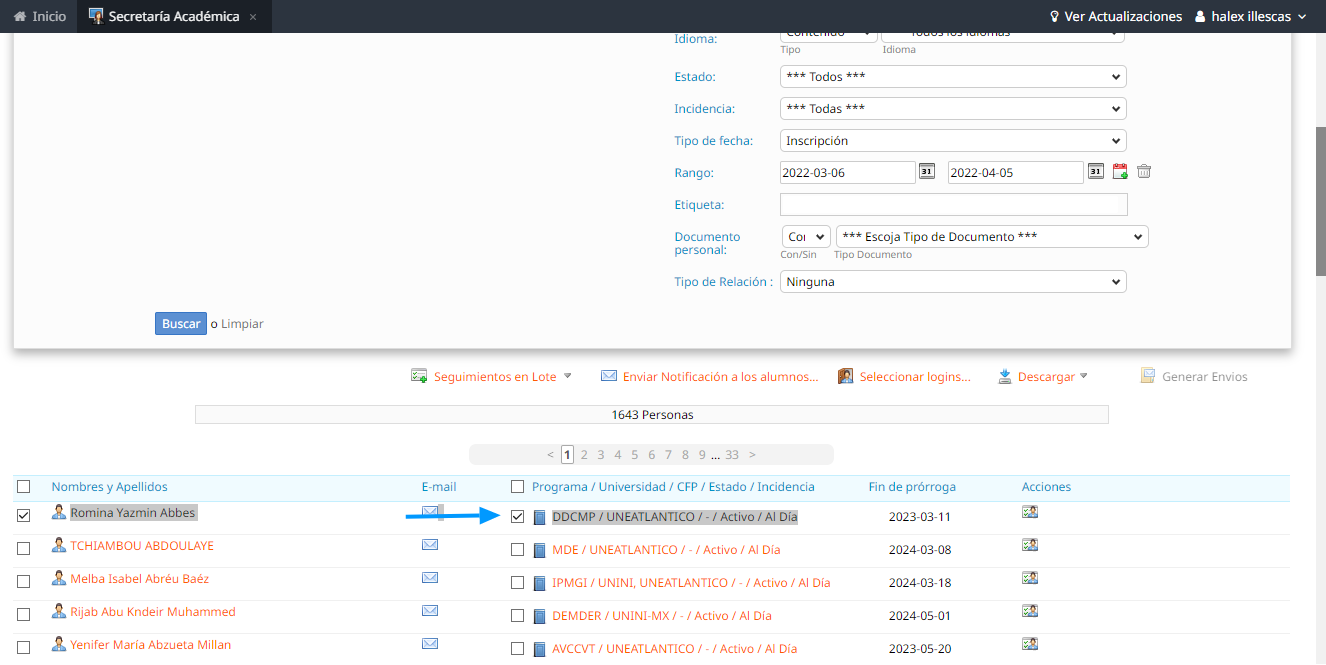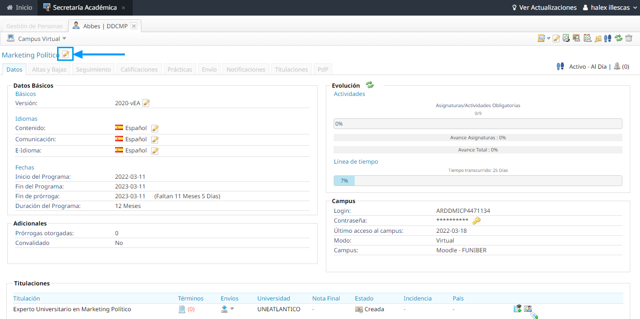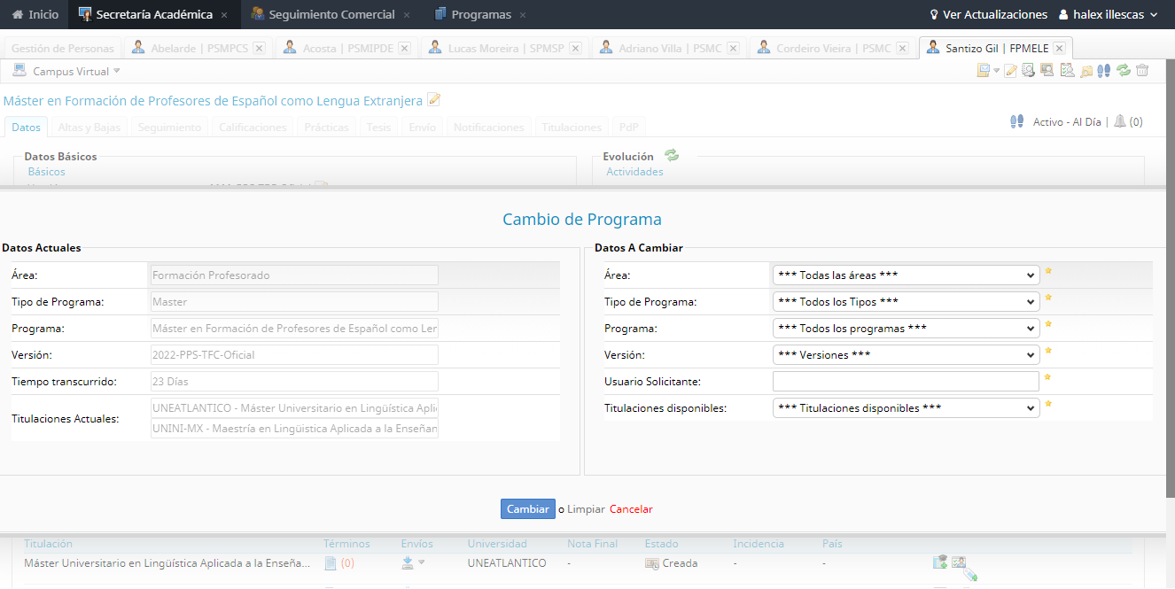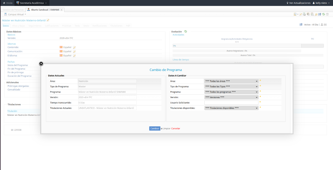 Luego el usuario técnico debe ingresar a la ficha del estudiante a sufrir el cambio de programa.
