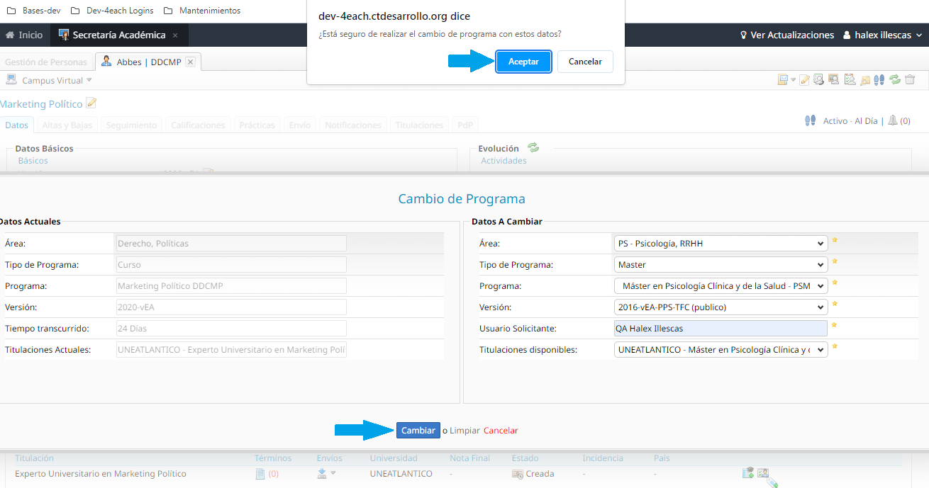 Al llenar todos los campos obligatorios y presionar el botón Cambiar nos mostrará un mensaje con la siguiente leyenda: ¿Está seguro de realizar el cambio de programa con estos datos?, tal como se muestra en la siguiente ilustración.