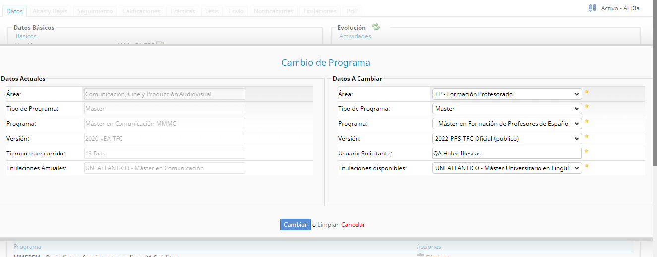 - Botón Cambiar: Este botón nos permite realizar el cambio de programa de la ficha académica.