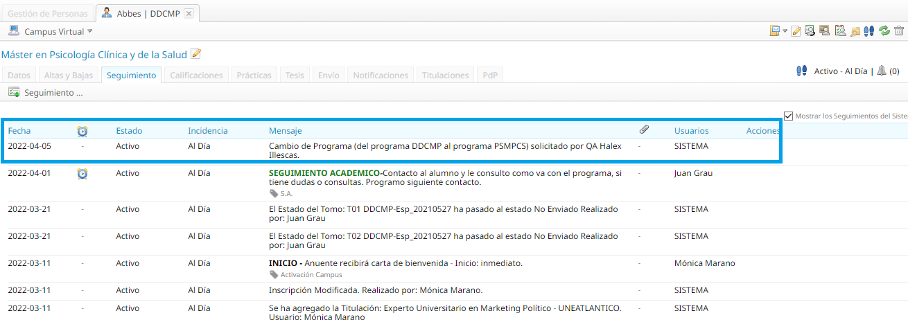 Al realizar el cambio de programa, la herramienta genera el seguimiento respectivo con la estructura siguiente: Cambio de Programa (del programa “Programa anterior” al programa “Programa nuevo”) solicitado por “Nombre del solicitante”.