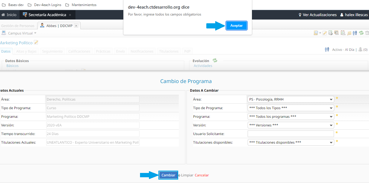 Antes de realizar el cambio de programa debemos tener en cuenta que, todos los campos deben estar llenos, de lo contrario la herramienta no nos permitirá realizar el cambio y mostrará una advertencia como se muestra en la siguiente ilustración.